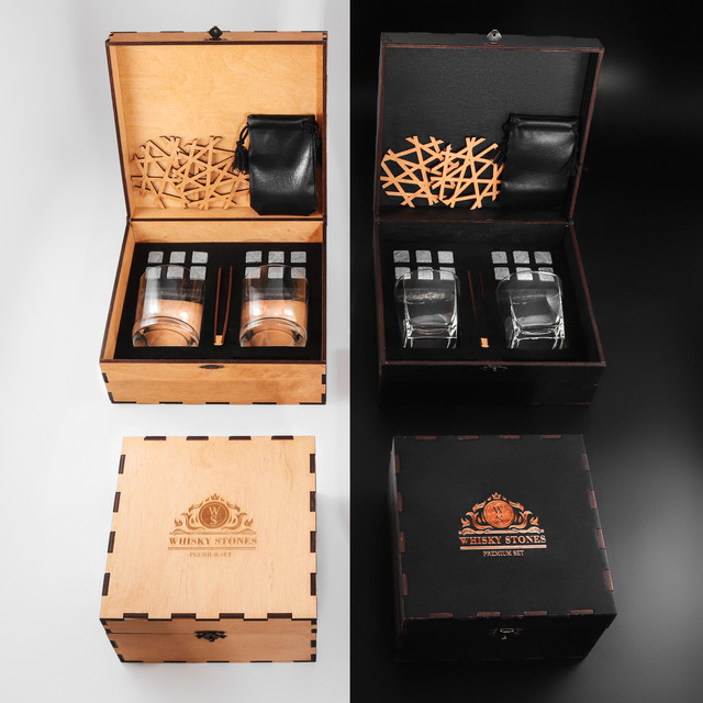 Якісне дерев'яне подарункове паковання 25 на 24 см на 11 см у темному дереві (є варіант у світлому дереві можете вибрати праворуч біля ціни варіант). Внутрішня частина — це м'який ложемент (камені та келихи завжди будуть цілі, красиво та престижно зберігати) у якому лежать оригінальні камені для віскі 12 шт., мішечок для каменів з екошкіри, 2 келихи на вибір, щипці та 2 підставки під келихи.